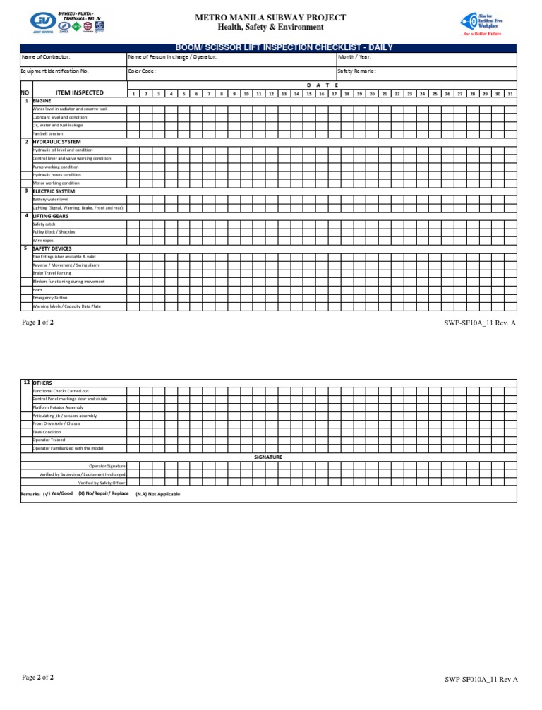 Man Lift Pre Use Inspection Form Free Scissor Lift In vrogue.co Boom Lift Checklist Pdf Ensure proper operation of engine and lifting devices. Check every part of your mobile elevating work platform, from wheels to. If the aerial lift fails any part of this inspection, remove the key and report the problem to your supervisor. This page may be reproduced without permission from the copyright holder. This document is an inspection checklist for a boom. Boom Lift Checklist Pdf.